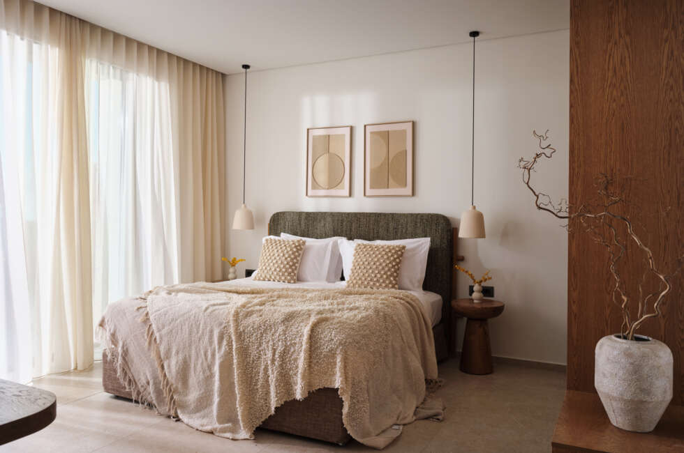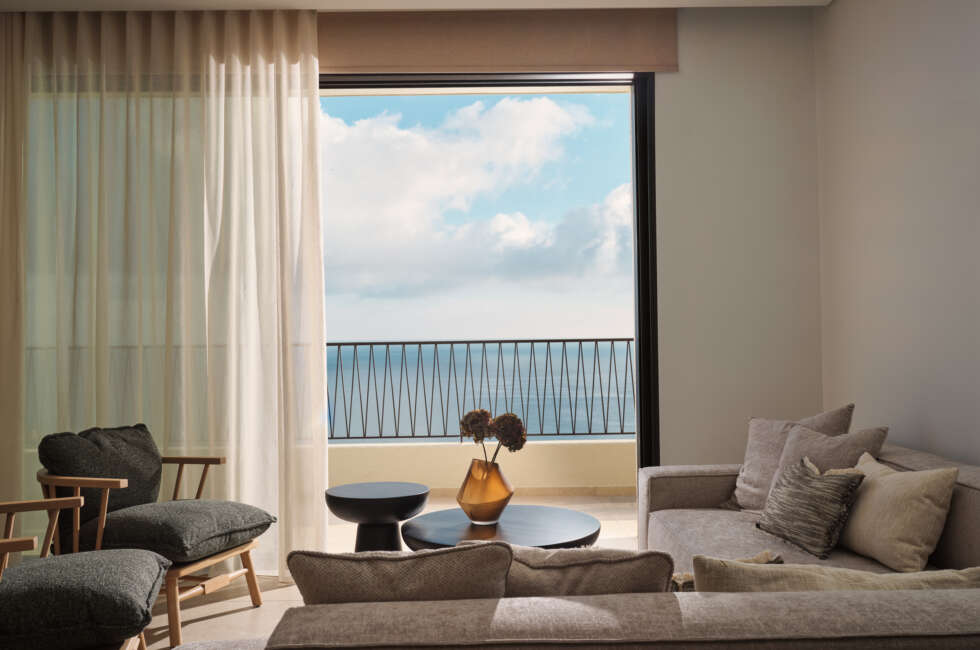 Three Master Bedrooms with King Size bed (1.80x2.00), all featuring en suite bathrooms, sink & indoor shower. Bonus - All bedrooms feature spectacular sea views. The bedrooms also feature Smart TV 43’’ and direct access to a balcony with sea views. The two available sea-view balconies are shared between the three bedrooms.